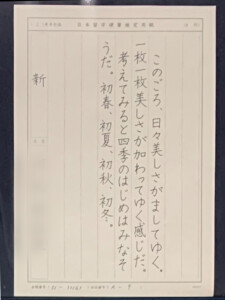 Iさんは、以前習っていた教室を辞められ、伊勢へ引っ越してきて次の教室を探し、当教室へ無料体験に来てくださいました。体験では一文字も書かれず、色々なことをお話してくださったり、疑問点を聞いてくださいました。「いつか、書で人に感動を与えられる書道家になりたい」そんな熱い想いをもたれ、ご自宅でも練習に励まれています。お手本も、漢字部(毛筆)と、最近になり、かな部も始められました。意欲的に練習に励まれるIさん。私が添削をしていると、時々視線を感じます…(笑)。書き姿勢(筆の動き)も学ばれているとのこと。私も共に日々精進していきますね!