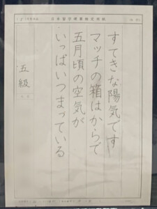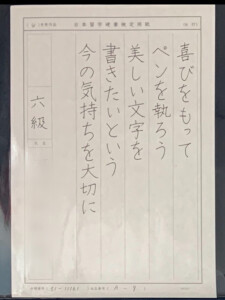 はじめは、講師が書くオリジナルのお手本で、名前・住所・ひらがなを練習し、2月〜ペン部のお手本をとられています。自宅でも、添削動画を見ながらたくさん練習してみえ、お手本を見る力がしっかりついてきました。毎月、清書を検定へ提出し、着実に昇級していっています。